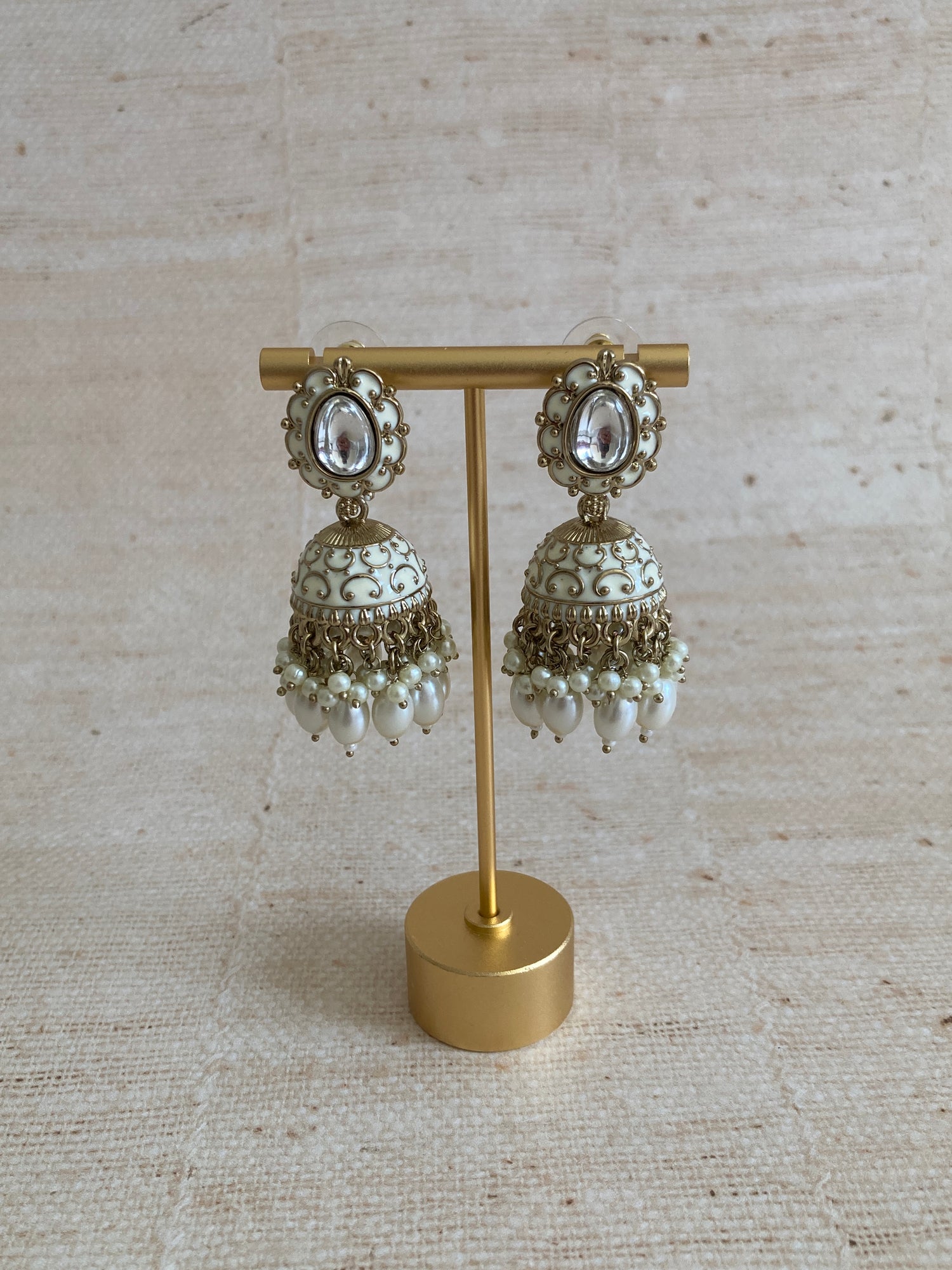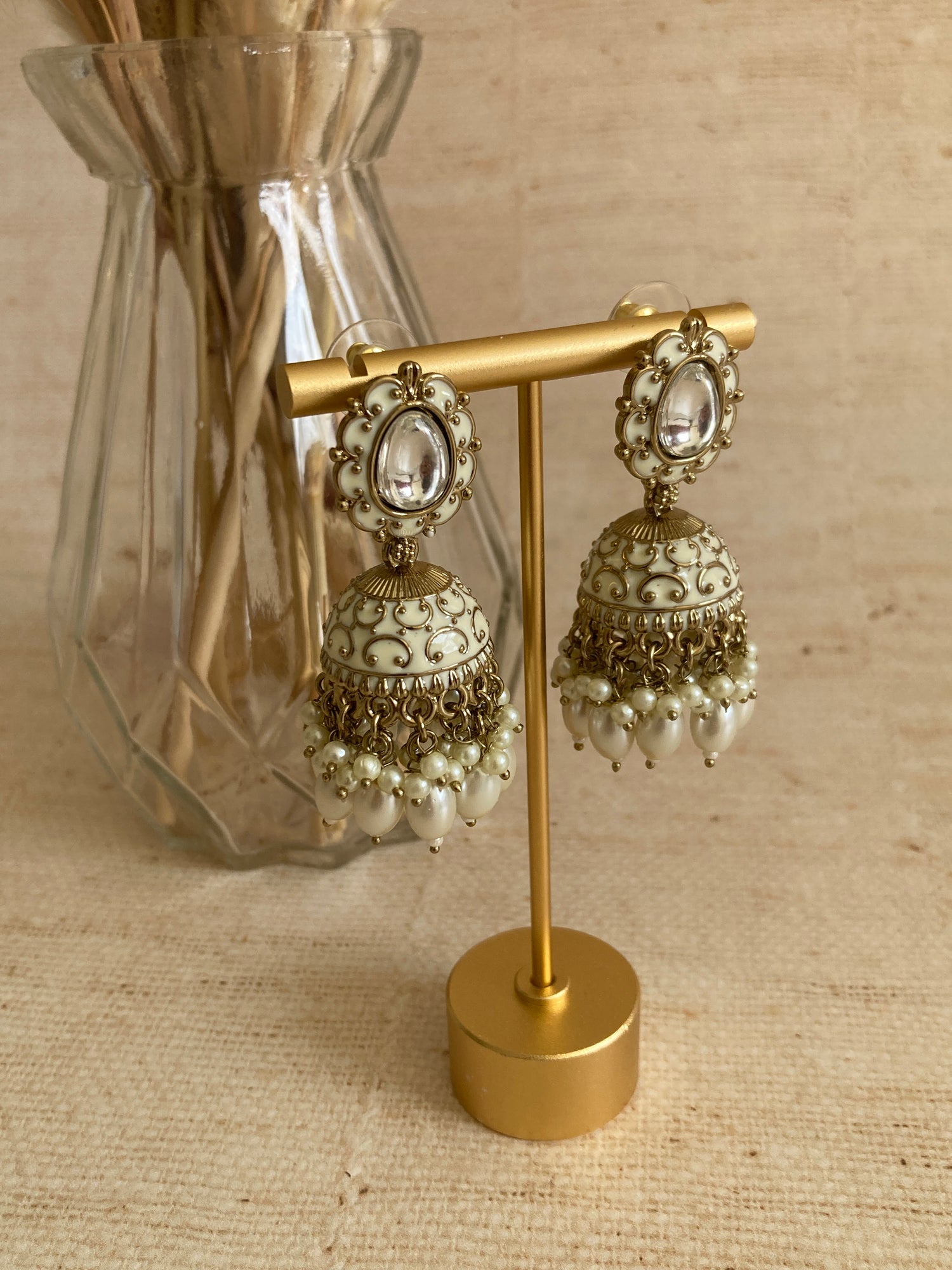 ⬥These Jhumki earrings showcase a beautiful Indo Western design, featuring intricate mehndi plating and elegant pearl accents.