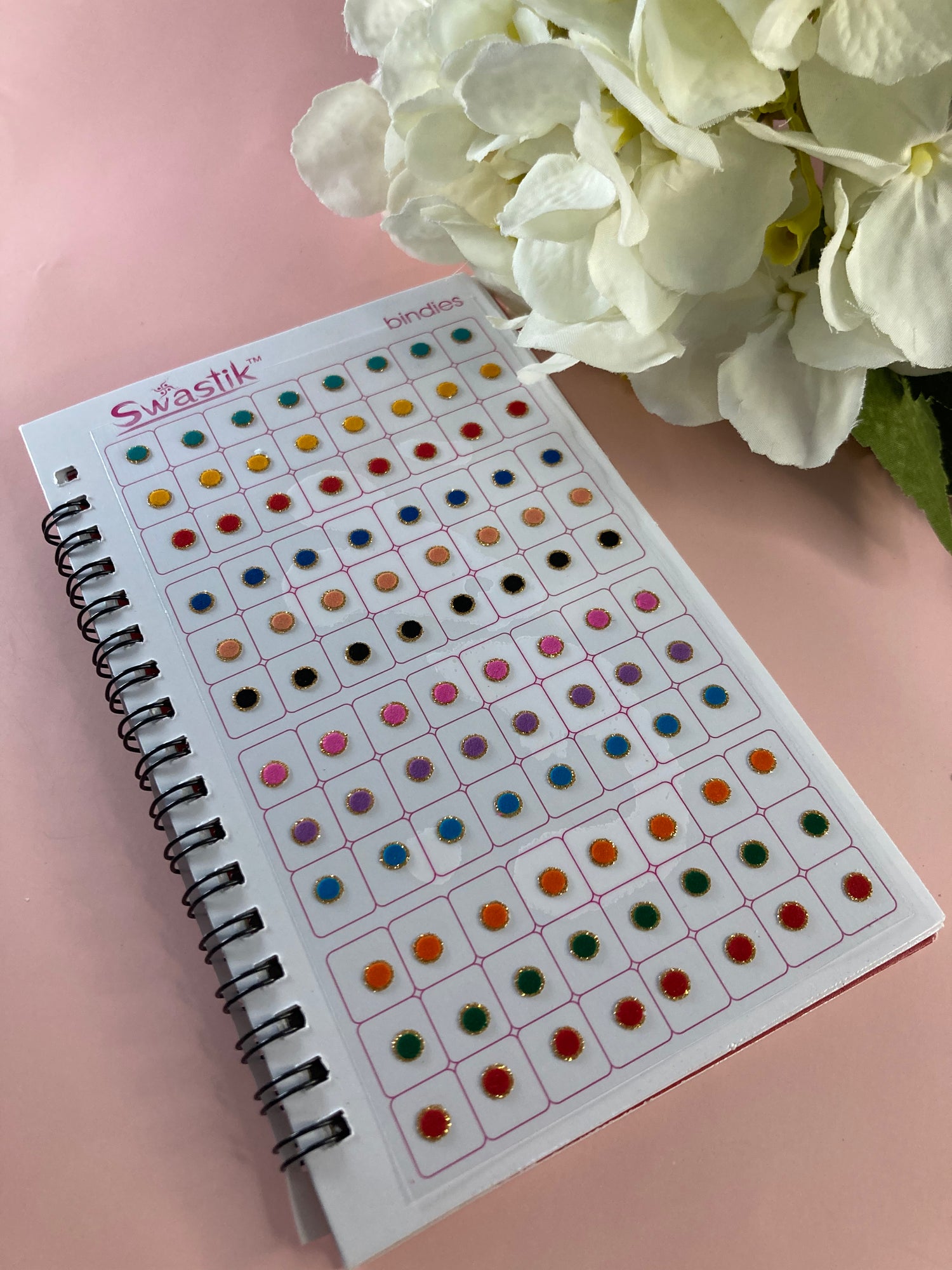 ⬥Assorted sizes (large, medium and small) round colourful golden zari border 576 bindi 6 page booklet.