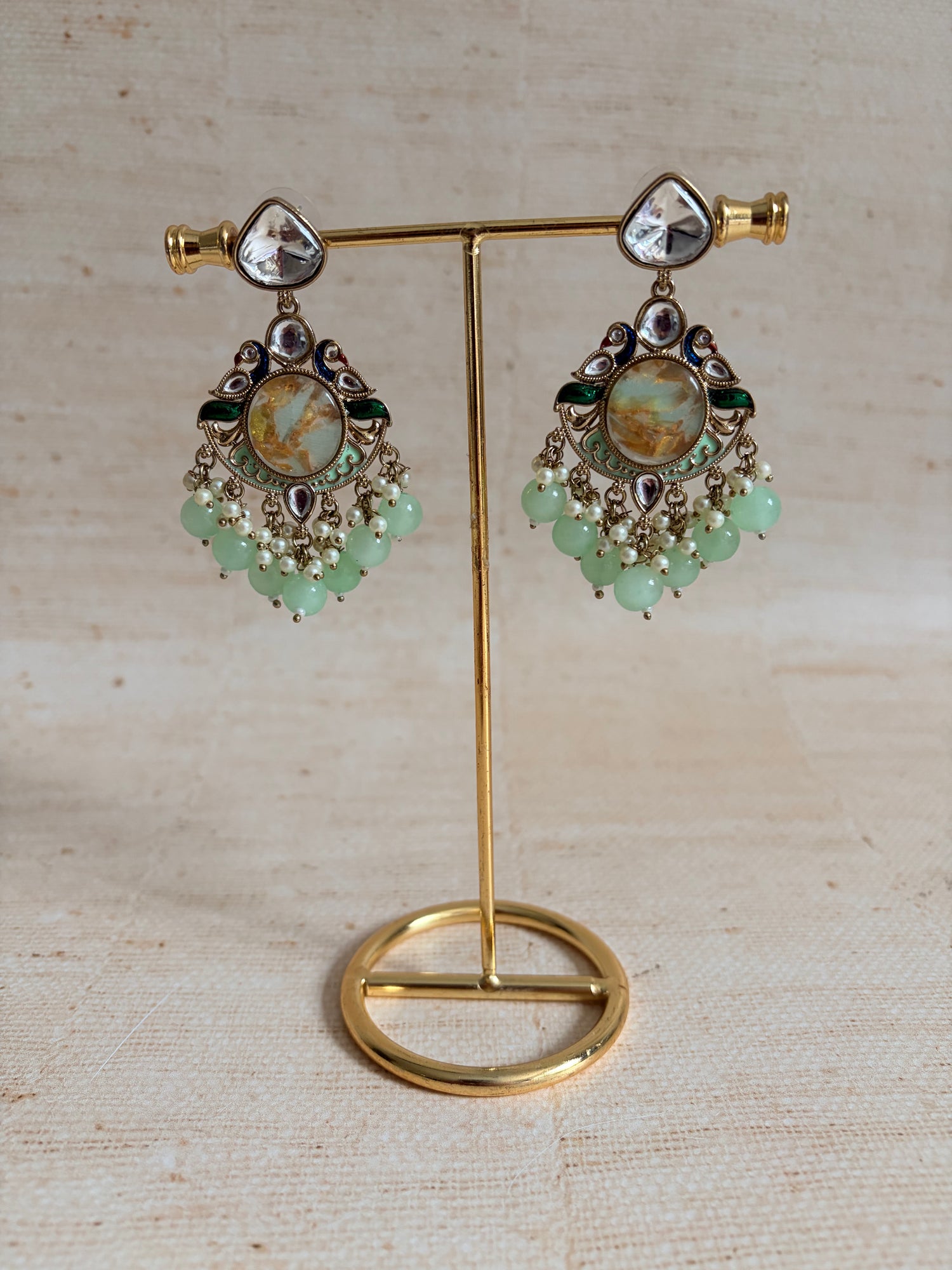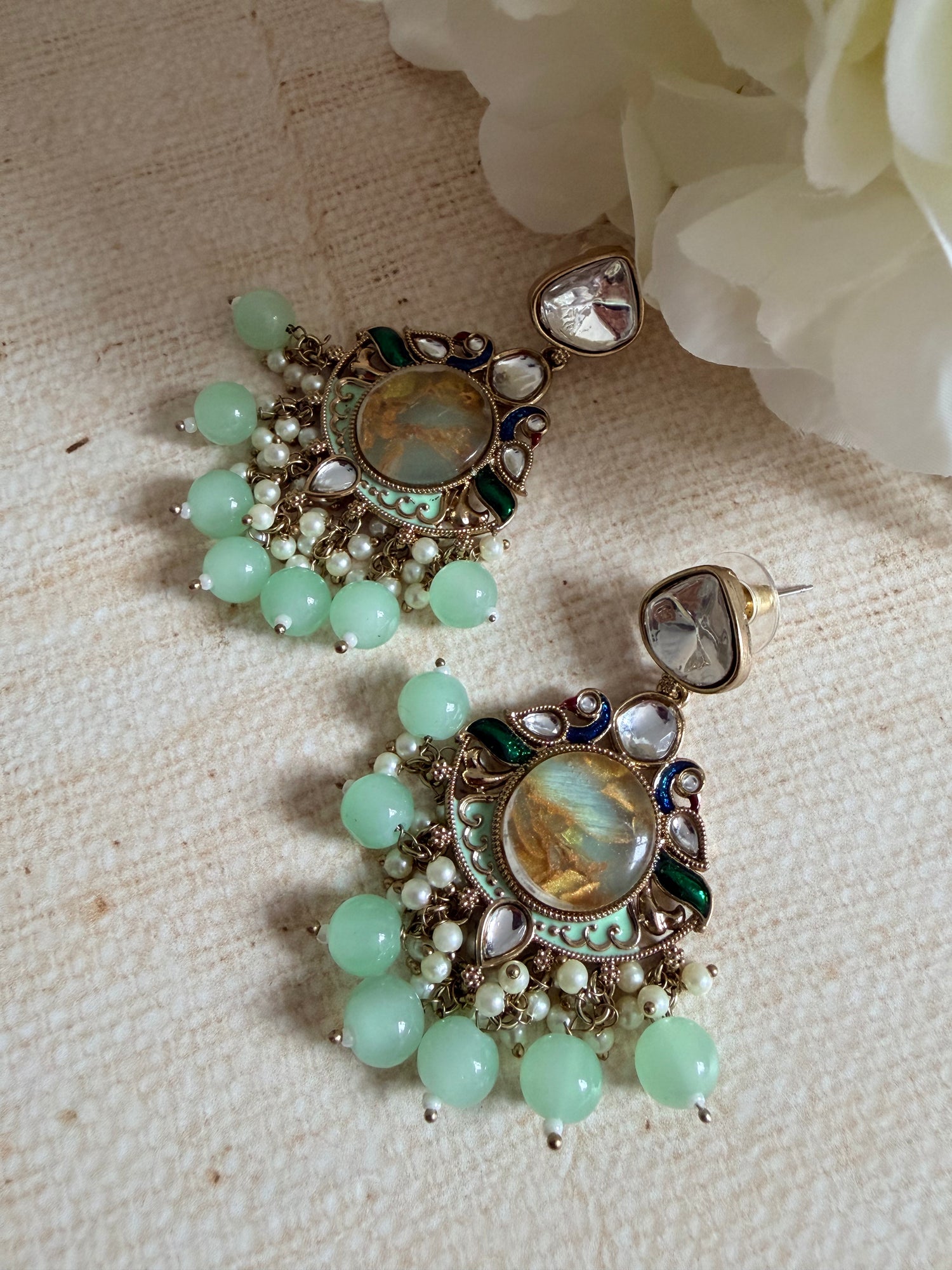 ⬥Discover the perfect balance of elegance and comfort with these stunning mint green kundan earrings. Lightweight yet visually captivating, they feature intricate detailing adorned with pearl beads.