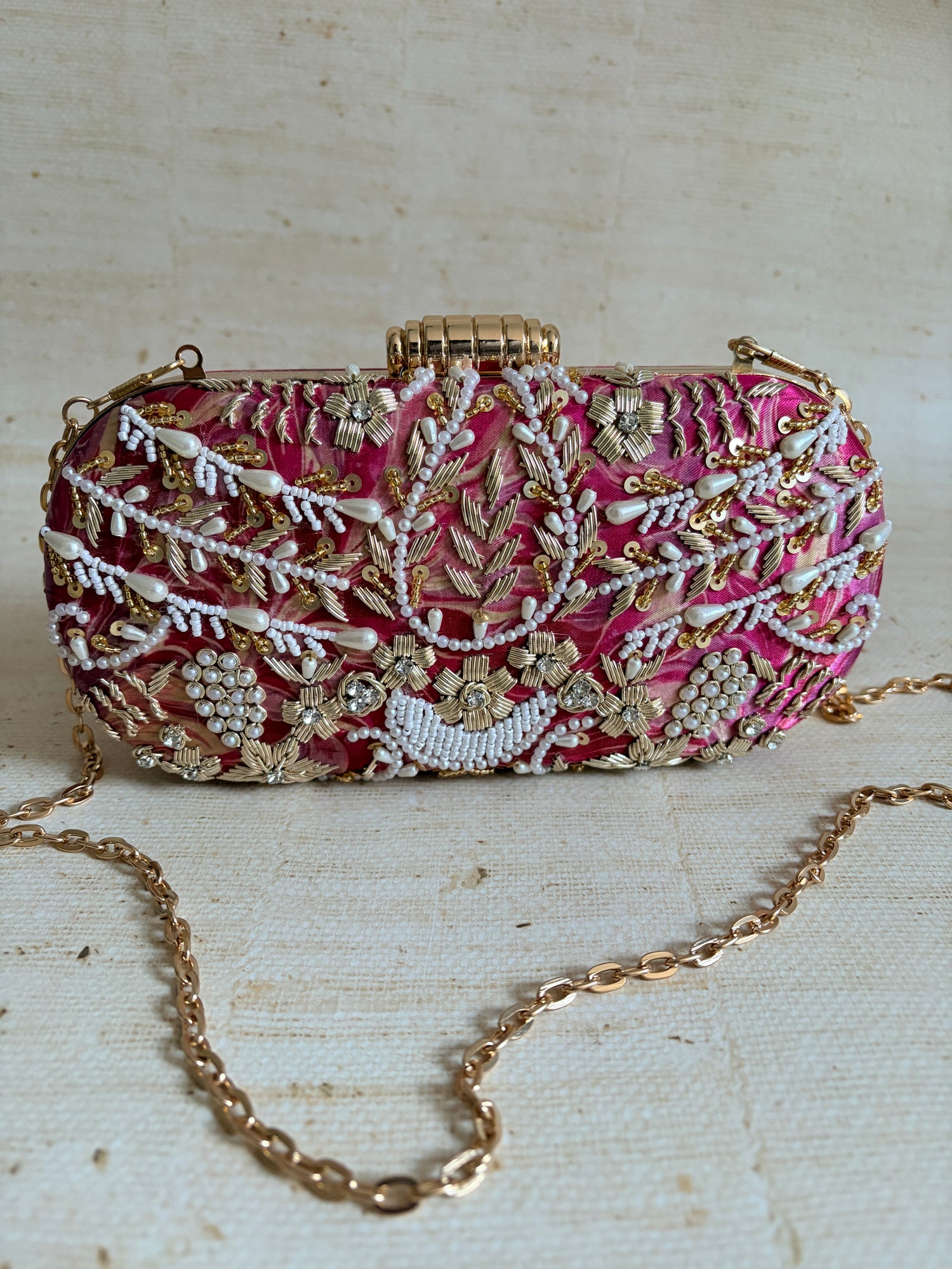 ⬥Amelia is a gorgeous oval shaped satin clutch with intricate handcrafted zardosi, thread work and pearl detailing. It has A stunning statement piece a must for your collection.