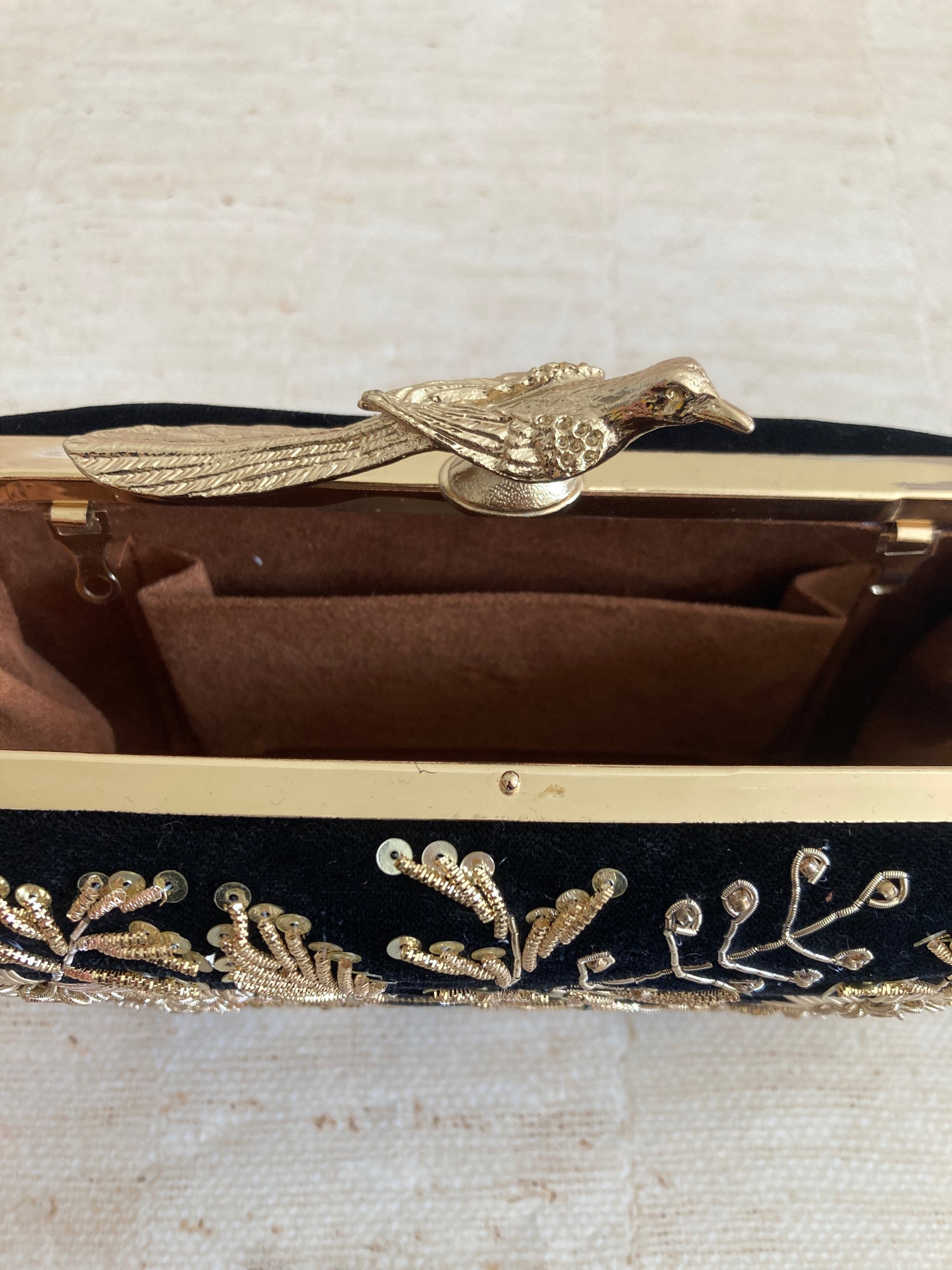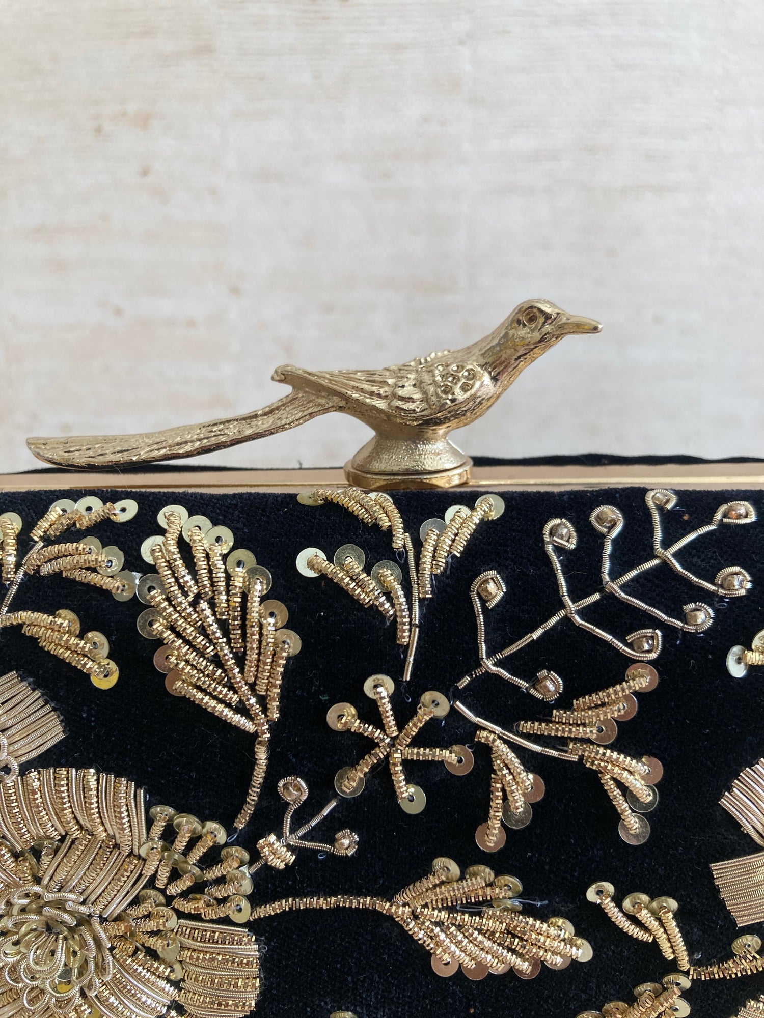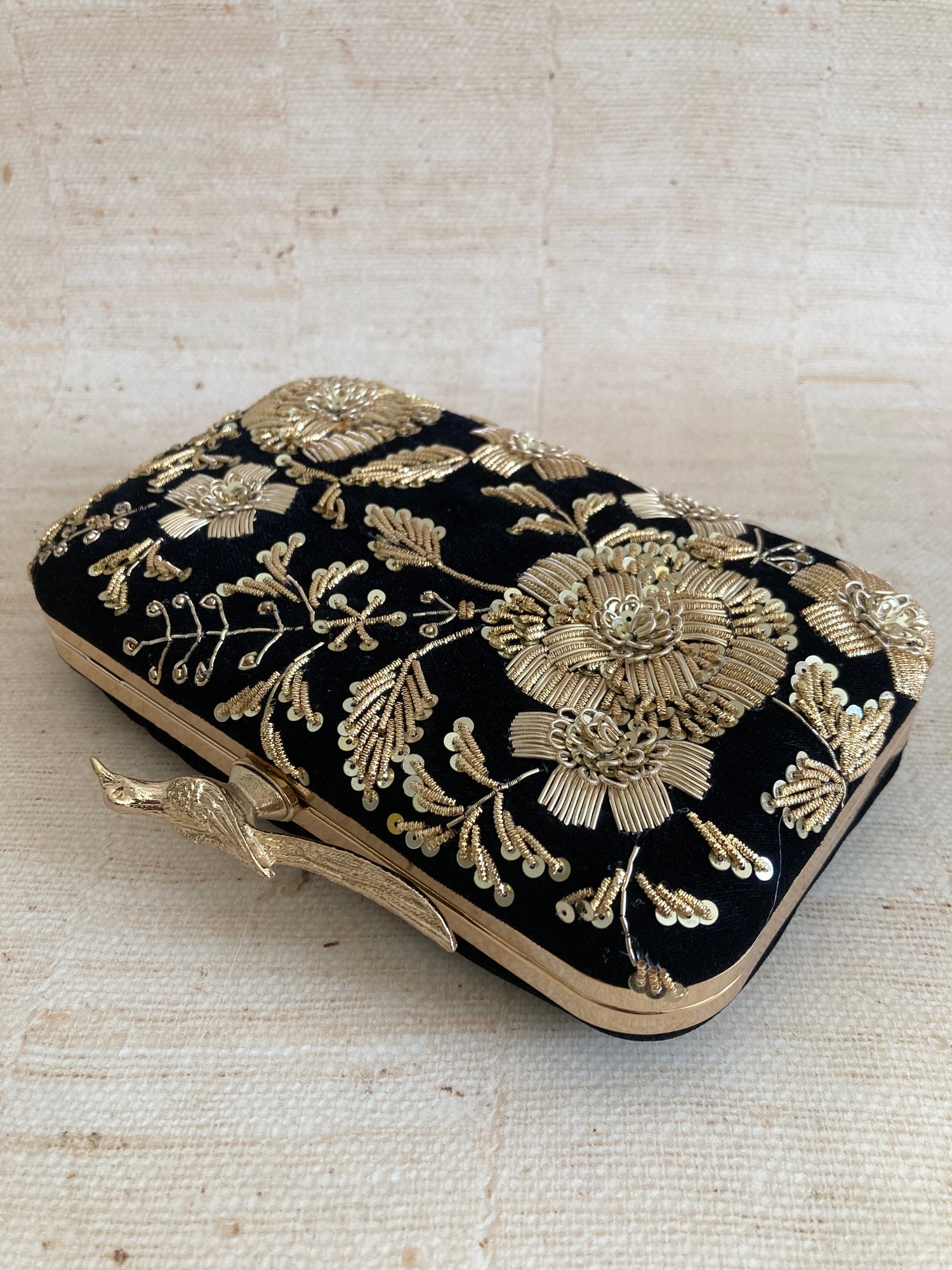 ⬥Laya is a gorgeous velvet rectangular clutch in black featuring intricate handcrafted gold zardozi work and a charming gold bird clasp.