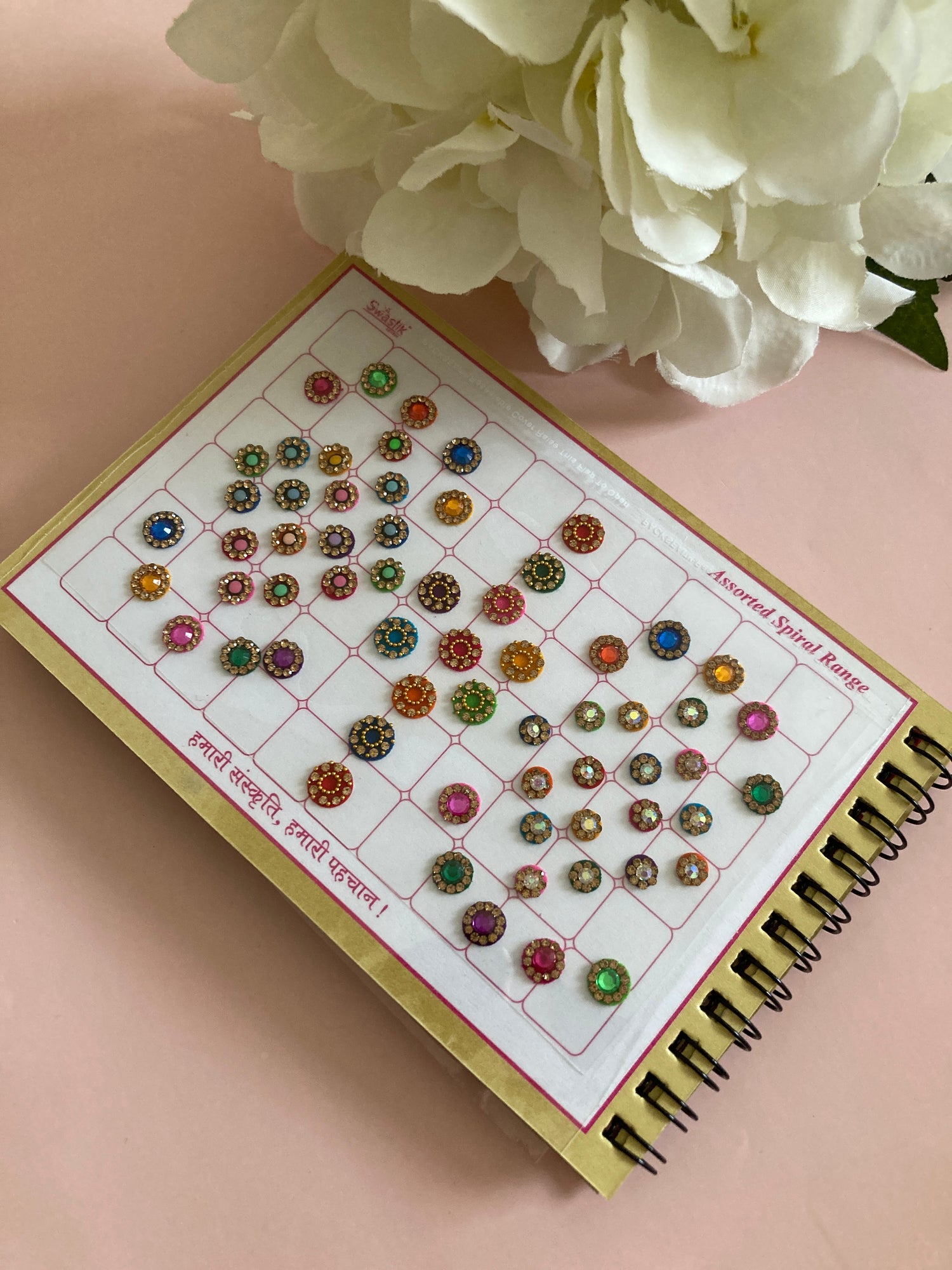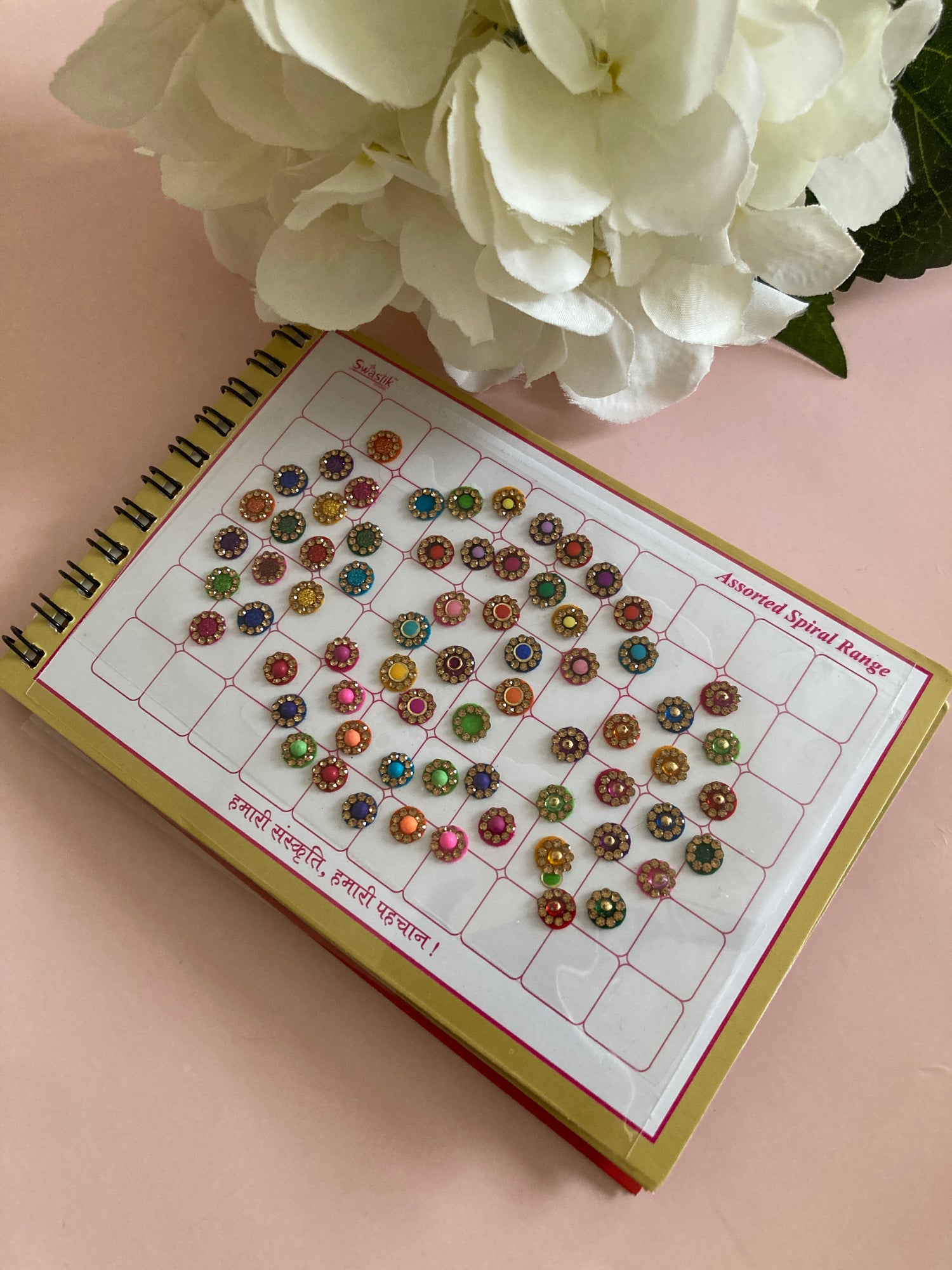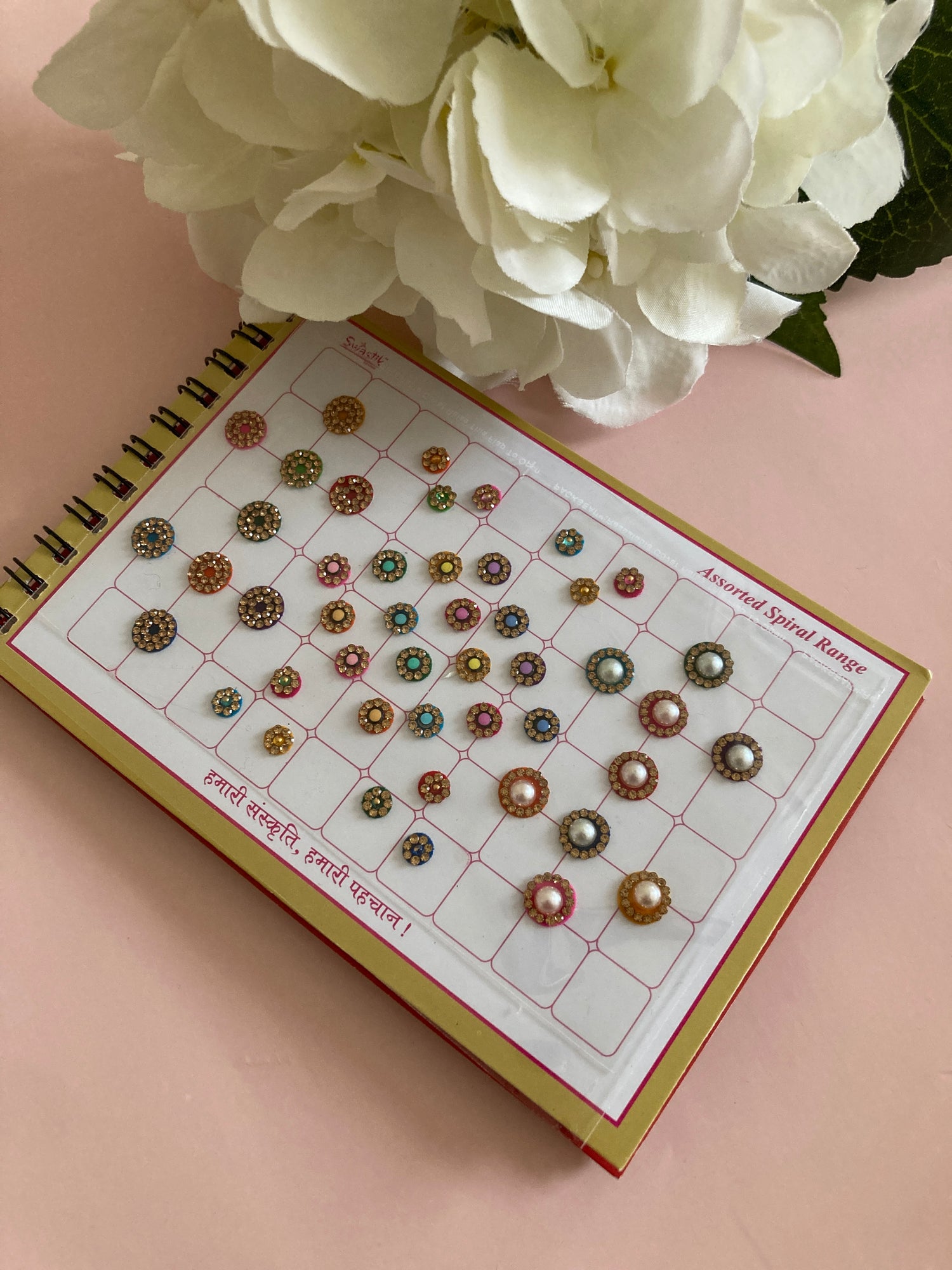 ⬥Assorted mixed designs and colours round 6 page bindi booklet. This book has a selection of beautiful pearl bindis.