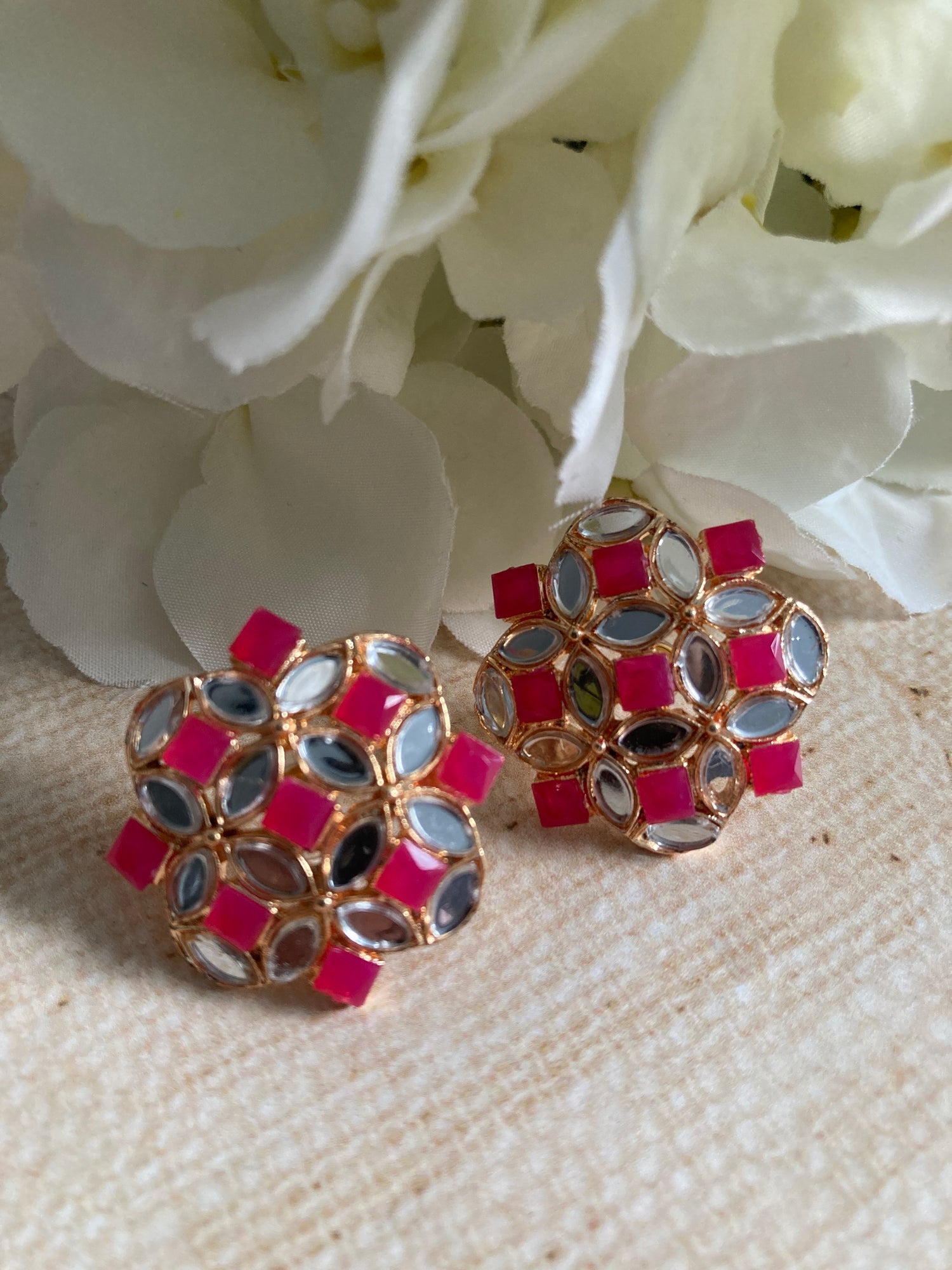 Roop Silver Mirror Stud Earrings (Hot Pink) (ST1010)