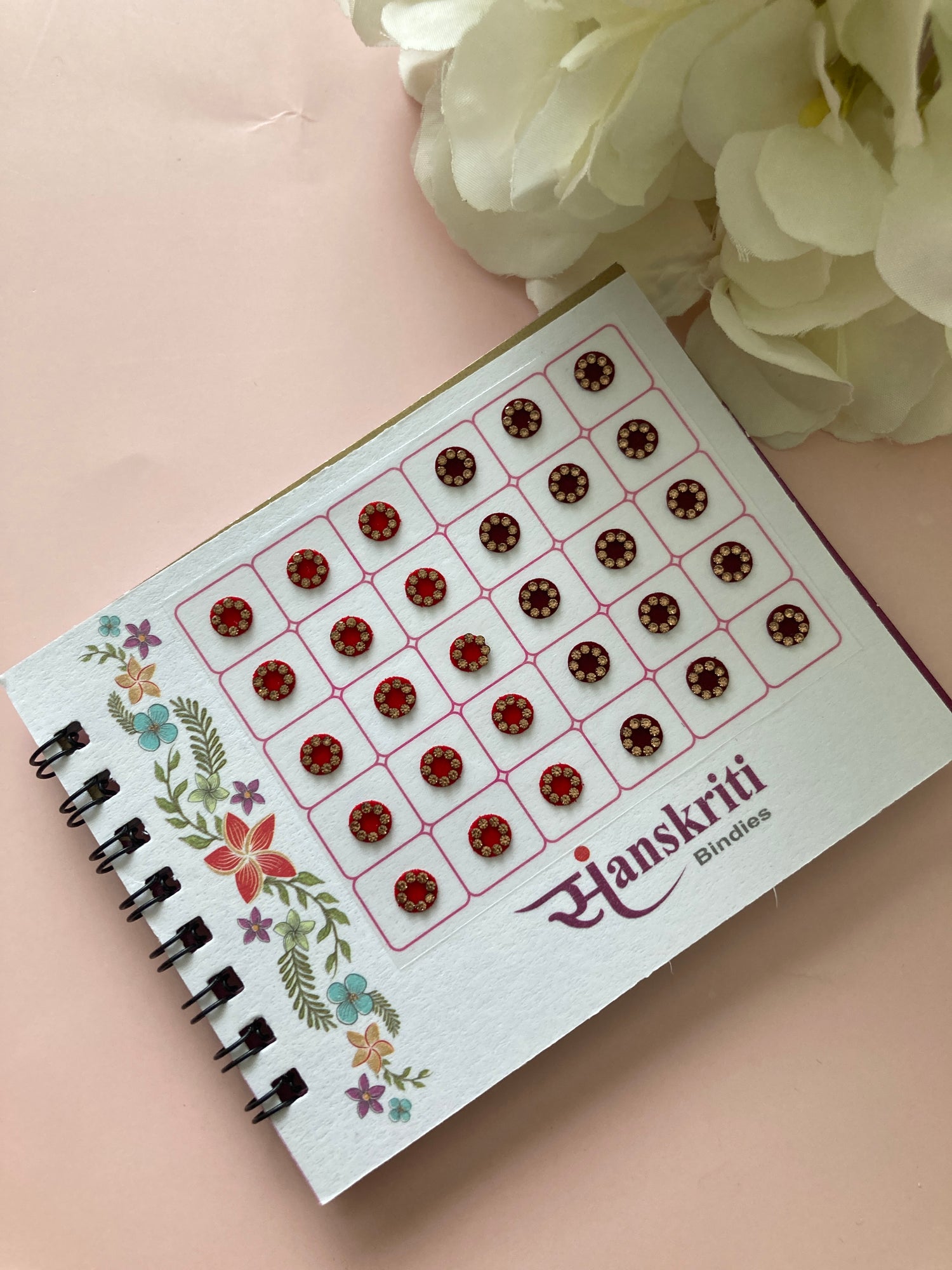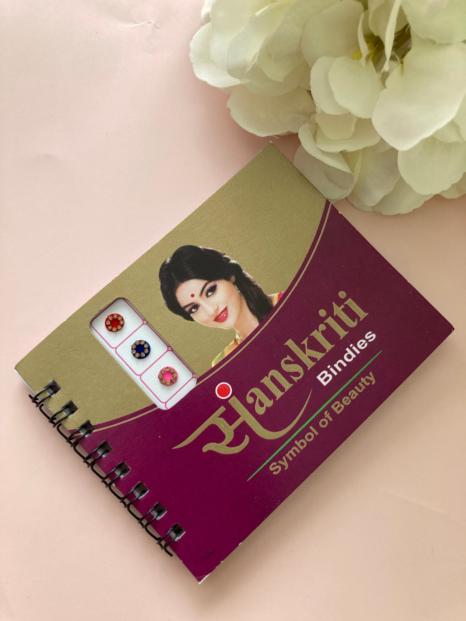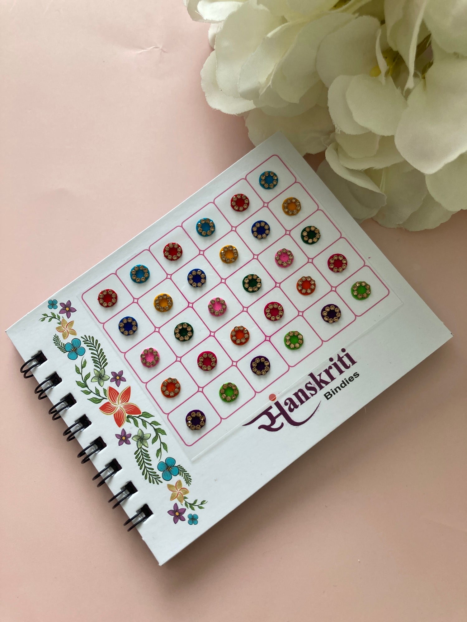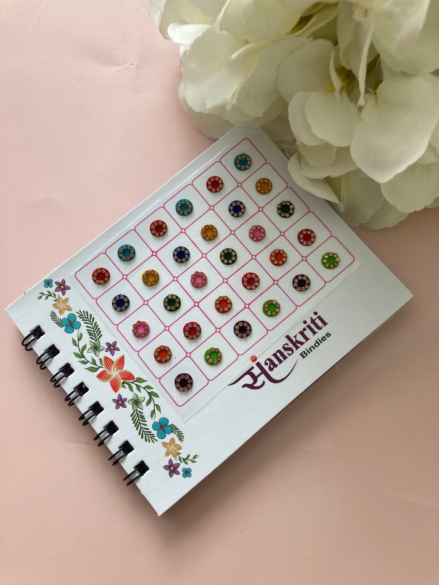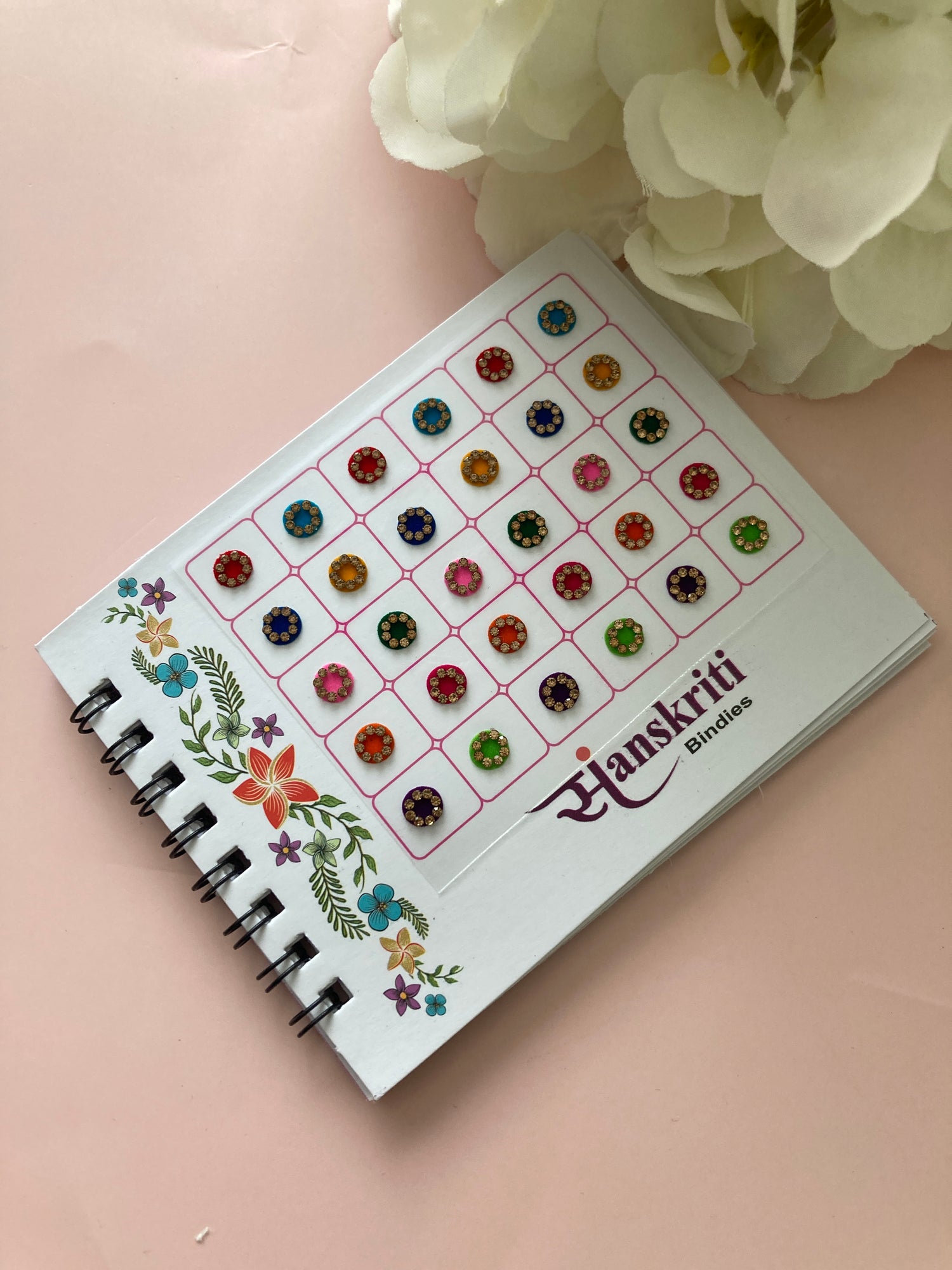⬥Assorted sizes round colourful multicoloured stone border 120 bindi 4 page booklet.