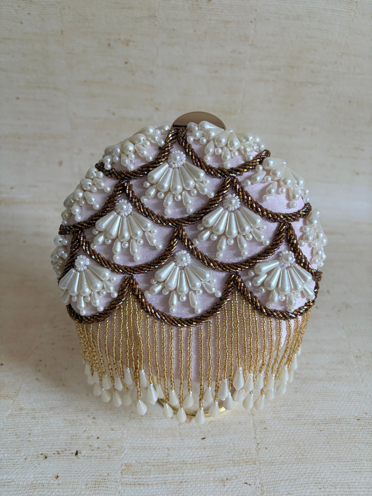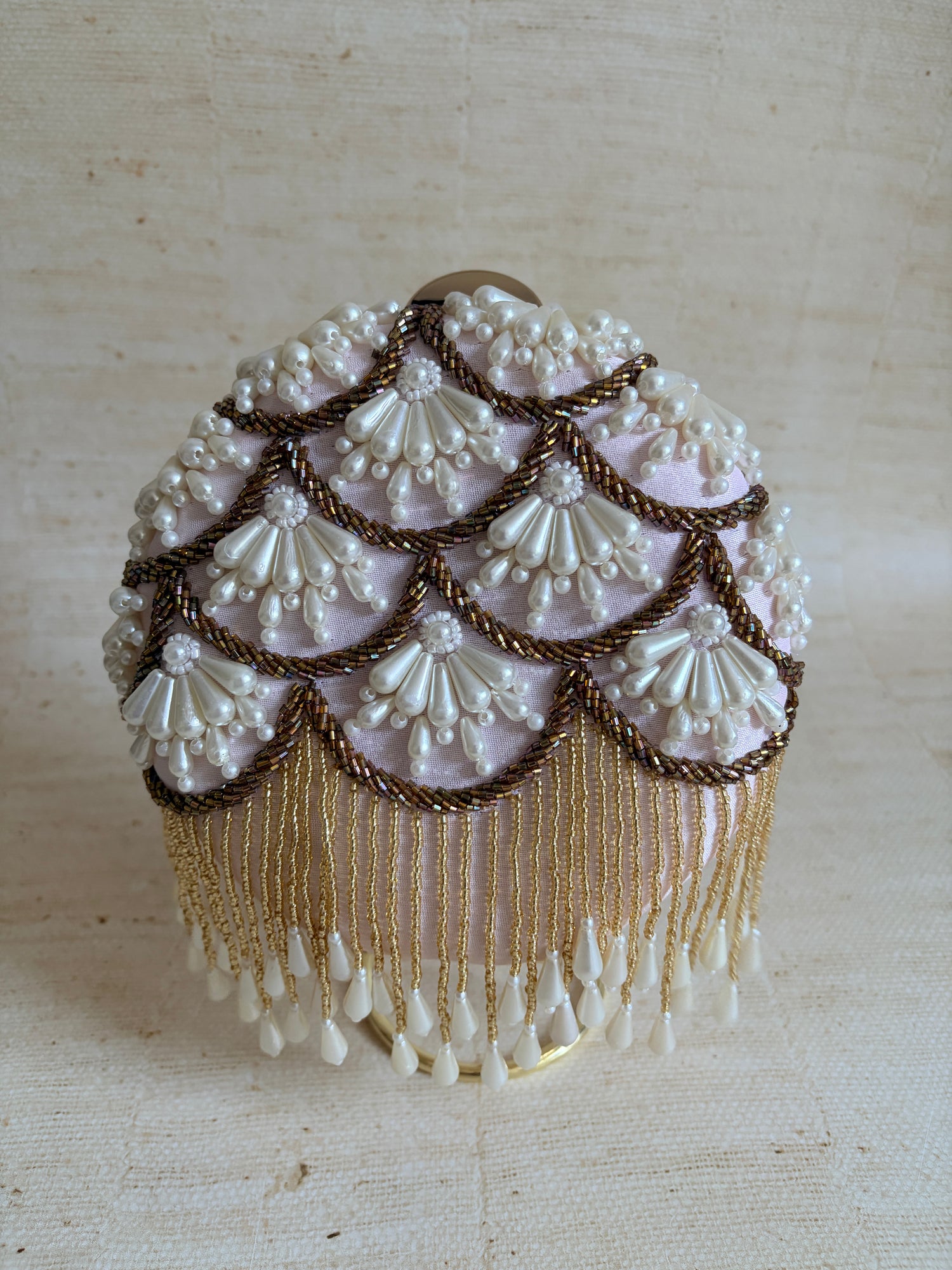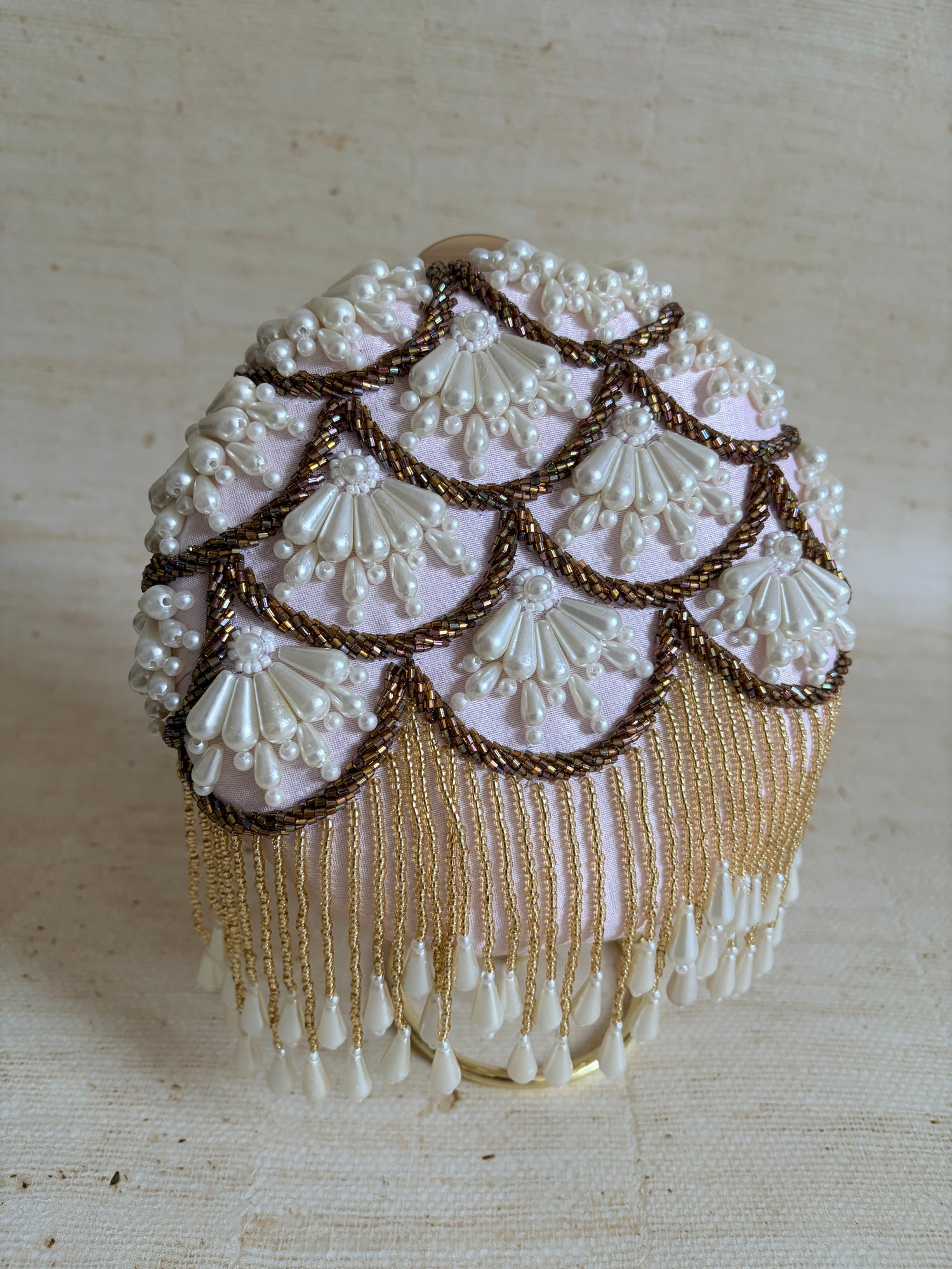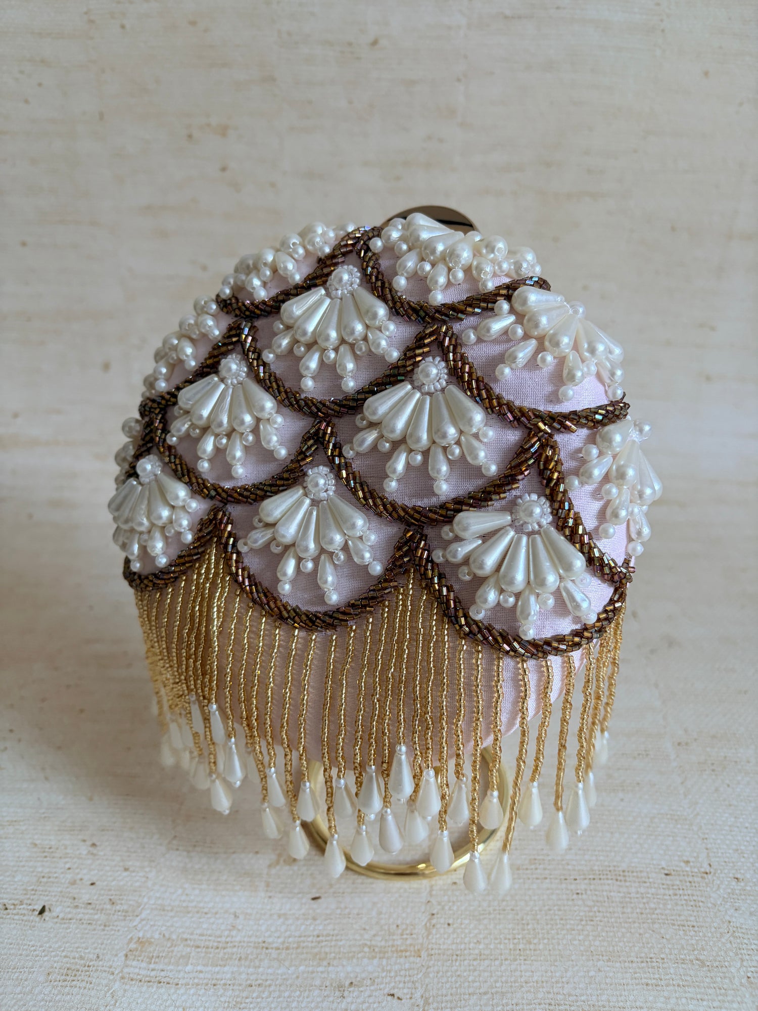 ⬥Sophia is an elegant round clutch embellished with pearls and sequins on a soft pink raw silk base. It has delicate heavily sequinned tassels complete with pearl drops. This clutch is a definite statement piece a must for your handbag collection.